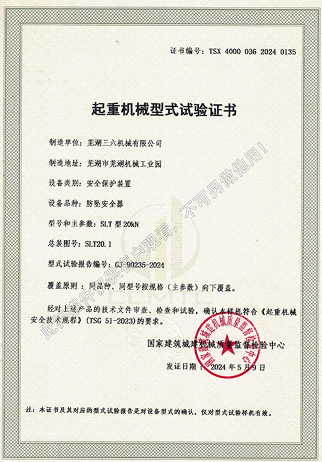 • SLT型20kN防墜器型式試驗(yàn)證書